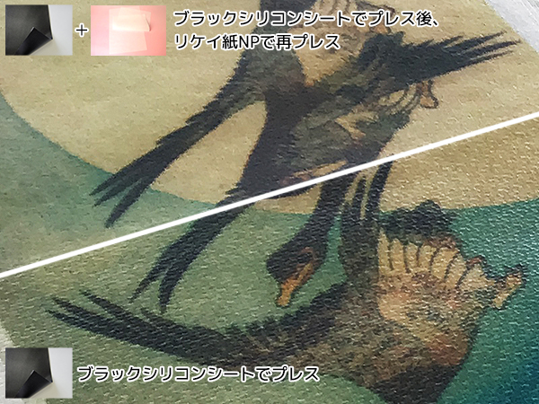 一度生地にのせてプレスすると、シートの模様である網目状のエンボス模様がつき、プリントマークをしっかりと生地目に食い込ませます。(DTFやラメシートなど、見た目が分かりにくいものもあります)