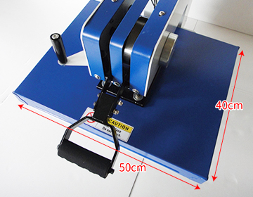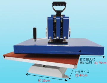 スウィング式熱プレス機は圧力調整ハンドルを回すことにより下ゴテの位置を調整する事ができるので