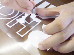 不要な部分を取り除き(カス取り)、プリント出来る状態にします。 カス取り作業はリタックシート(アプリケーションシート)に貼る前でもかまいません。