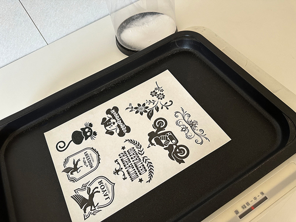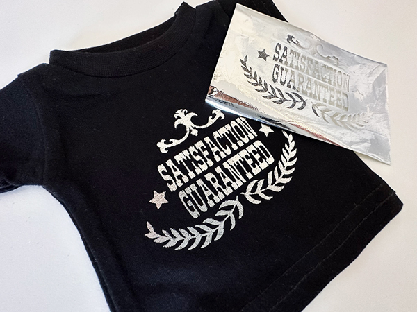 メタリックホイルを乗せ熱プレスし、冷めたら剥がせば完成。